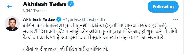 उत्तर प्रदेश के पूर्व मुख्यमंत्री अखिलेश यादव ने रविवार को कहा कि कोरोना वायरस का टीकाकरण एक संवेदनशील प्रक्रिया है। इसी कारण देश तथा प्रदेश की भाजपा सरकार इसे कोई सजावटी-दिखावटी इवेंट न समझे। इसको अग्रिम पुख़्ता इंतजामों के बाद ही शुरू करे। समाजवादी पार्टी के प्रमुख अखिलेश यादव ने कहा कि यह लोगों के जीवन का विषय है, अत: इसमें बाद में सुधार का खतरा नहीं उठाया जा सकता है। उन्होंने कहा कि गरीबों के टीकाकरण की निश्चित तारीख घोषित हो।