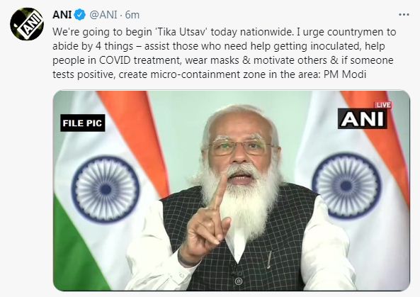 इस पर पीएम मोदी ने कहा है कि हम आज देशभर में ‘टीका उत्सव’ शुरू करने जा रहे हैं। मैं देशवासियों से आग्रह करता हूं कि वे 4 चीजों का पालन करें – जिन लोगों को टीका लगवाने में मदद की जरूरत है, COVID उपचार में लोगों की मदद करें, मास्क पहनें और दूसरों को प्रेरित करें और यदि कोई व्यक्ति सकारात्मक परीक्षण करता है, तो क्षेत्र में सूक्ष्म-नियंत्रण क्षेत्र बनाएं।