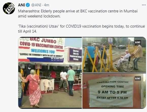 महाराष्ट्र के मुंबई में वीकेंड लॉकडाउन में बीकेसी टीकाकरण केंद्र पर बुजुर्ग लोग पहुंच रहे हैं। देश भर में आज से COVID-19 टीकाकरण के लिए ‘टीका उत्सव’ शुरू होगा।