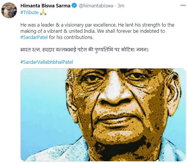 असम (Assam) के शिक्षा मंत्री हेमंत विस्वा शर्मा (Himanta Biswa Sarma) ने भी सरदार पटेल को उनकी जयंती पर याद किया। उन्होंने ट्वीट में लिखा- वह एक नेता और एक दूरदर्शी समानता थी। उन्होंने एक जीवंत और एकजुट भारत बनाने के लिए अपनी ताकत उधार दी। हम हमेशा उनके योगदान के लिए सरदार पटेल के ऋणी रहेंगे। भारत रत्न, सरदार वल्लभभाई पटेल की पुण्यतिथि पर कोटिश: नमन।