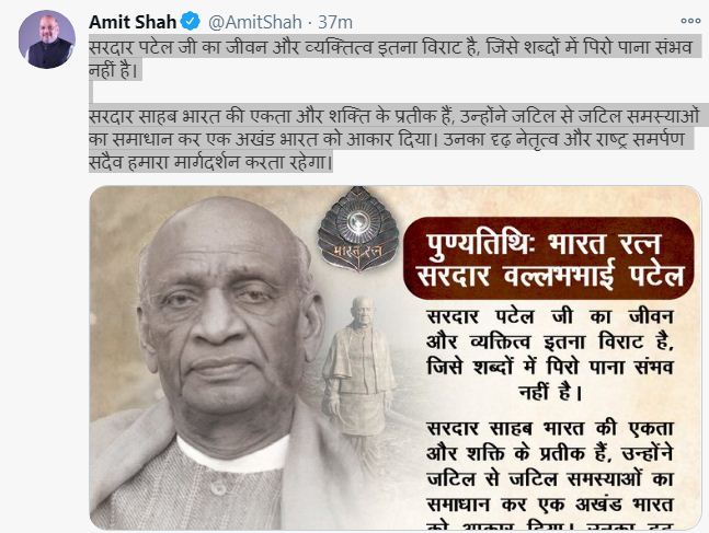 गृह मंत्री अमित शाह ने भी सरदार पटेल को उनकी पुण्यतिथि पर याद किया है। अमित शाह ने एक ट्वीट में लिखा- सरदार पटेल जी का जीवन और व्यक्तित्व इतना विराट है, जिसे शब्दों में पिरो पाना संभव नहीं है। उन्होंने आगे लिखा कि सरदार साहब भारत की एकता और शक्ति के प्रतीक हैं, उन्होंने जटिल से जटिल समस्याओं का समाधान कर एक अखंड भारत को आकार दिया। उनका दृढ़ नेतृत्व और राष्ट्र समर्पण सदैव हमारा मार्गदर्शन करता रहेगा।