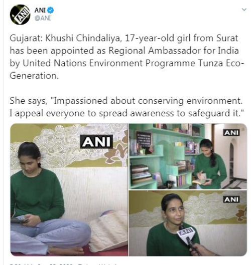 सूरत की 17 वर्षीय खुशी चिंदालिया को UNEP ने भारत में बनाया अपना ‘ग्रीन एंबेसडर’