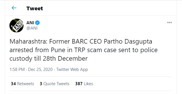मुंबई। टीआरपी घोटाले में महाराष्ट्र में BARC के पूर्व सीईओ पार्थो दासगुप्ता को आज पुणे से गिरफ्तार किया गया है। 28 दिसंबर तक उन्हें पुलिस हिरासत में भेजा गया है। फर्जी टीआरपी घोटाले में मुंबई पुलिस की क्राइम ब्रांच ने ब्रॉडकास्ट ऑडियंस रिसर्च काउंसिल(BARC) के पूर्व सीईओ को गिरफ्तार किया गया है।