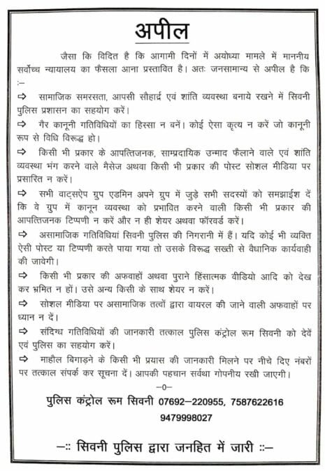 सिवनी, खबर सत्ता : सर्व जन साधारण को सूचित किया जाता है कि सोशल मीडिया प्लेटफॉर्म जैसे व्हाट्सएप, फेसबुक, इंस्टाग्राम, टि्वटर टेलीग्राम, टिक टॉक एवं लाइक आदि के माध्यम से अनैतिक अथवा भड़काऊ मैसेज एवं वीडियो वायरल ना करें और ना ही लाइक अथवा शेयर करें ऐसा किए जाने पर आपके विरुद्ध वैधानिक कार्यवाही की जा सकती है। जिला पुलिस सिवनी
